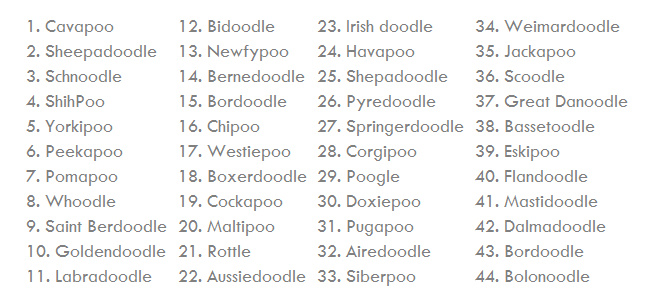 There are dozens of Doodle types out there now, but a few are more popular and easy to find than others. If you have never had a Doodle before, look at the top 44 most popular breeds listed below, ordered by “popularity,” and see which one might fit for you and your family